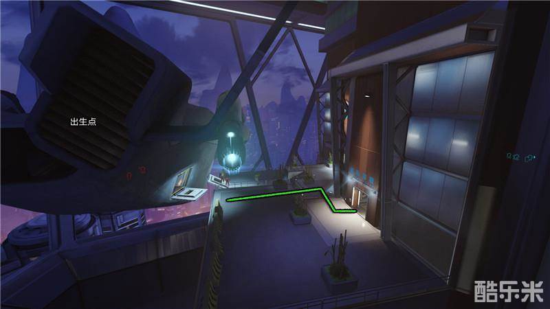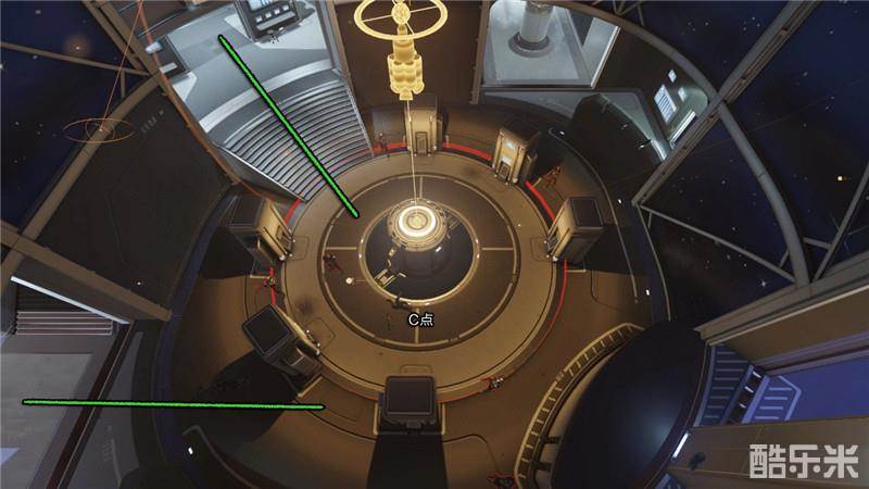 双方沿着图中所示绿色线条进入争夺C点。C点处在一个环形的房间内部,双方可以利用内部的设施作为掩体进行攻防战。最终拿下此点的一方即为本图漓江天塔的获胜方。