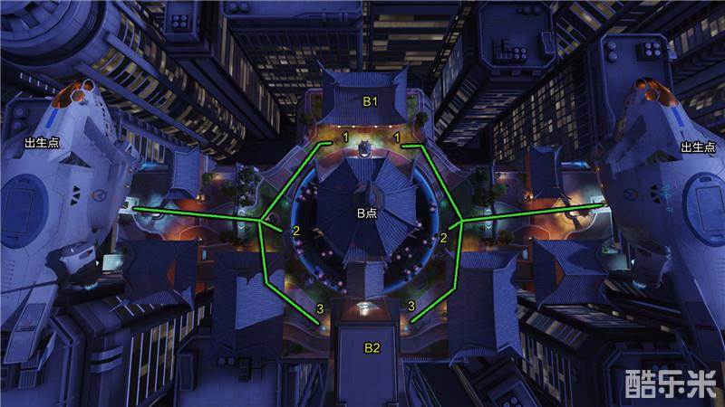 B2是位于一个通道的内部,其中有一个血包,埋伏在此可以打击从B点内部屏风另一侧涌过来的敌人,需提防被敌方线路3的进攻所消灭。