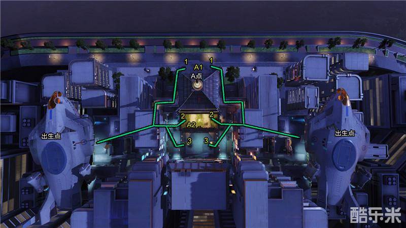 进攻线路有三条。线路1从A点上方绕路进攻。线路2从正面进攻,然后从A点的下方进入。线路三从右翼进攻,可配合线路2的队友推进。