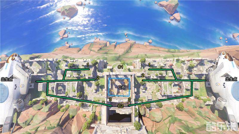 C2位于C点的正下方,可以从后门打击C点里面的敌方势力,同时兼顾防守敌方线路3的攻势。