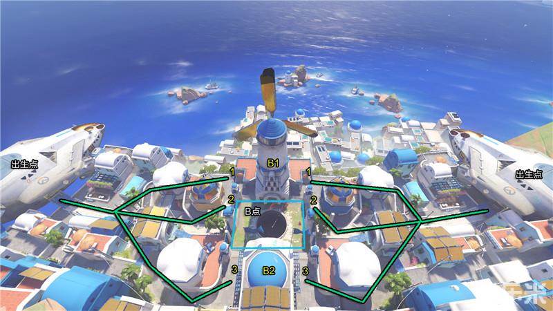 推荐的防守点:B1所在位置建筑内部,可以直接防守B点,须提防的是,从侧面过来的地方偷袭。B2所在位置也是攻防兼备的一个点,可以兼顾B点与线路3敌方进攻的防守。