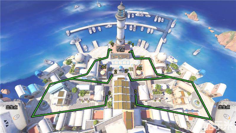 进攻的线路有三条。线路1从地图上方绕路直接进入A点的侧门。线路2从正面进攻A点的正门线路3从右翼进攻,配合线路2的队友进攻。