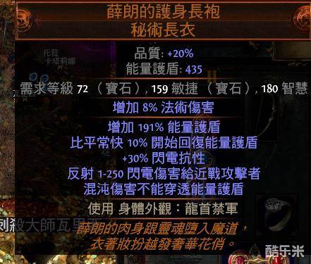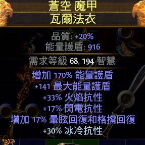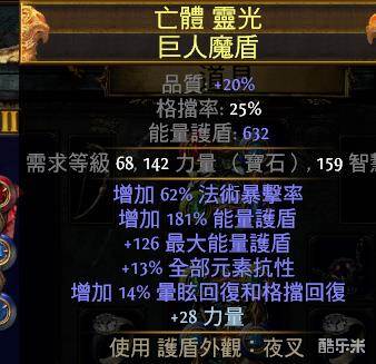 盾:ES+法爆/法伤,法伤面板上会比法爆好看一点...不过法爆稍微还是比较实用的,选个好点的盾刀雨无蓝球暴击能到60%左右,不过我的盾法爆低了点。
