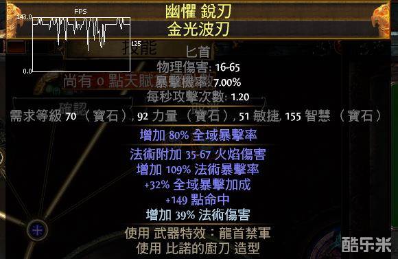 武器选择:很重要!!!金光或者白金最好,80%全域暴击,法伤+法爆+全域爆伤+法术电点伤,电点伤是为了暴击感电,比较好的选择,不过这个匕首比较难找,预言我好像没怎么见到,我的是火点伤....