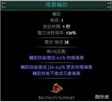 【残暴(Brutality Support )】:35-54% 更多物理伤害,辅助的技能无法造成元素伤害。