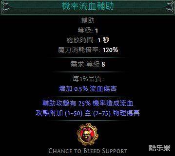 【几率流血(Chance to Bleed Support)】:附加(1级 1-2 20级 50-75) 物理攻击伤害. 25% 几率造成流血.