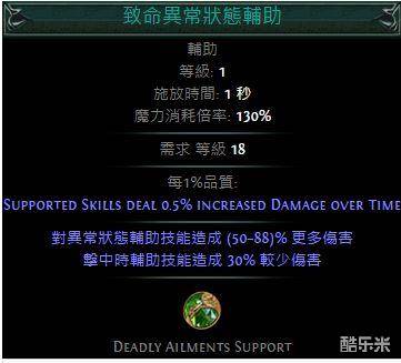 【致命异常状态(Deadly Ailments Support)】 50-88% 更多异常伤害. 33% 较少击中伤害.