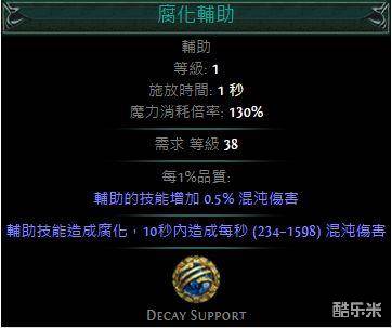 【腐化(Decay Support)】:技能附加腐化, 每秒造成 (1级 234 20级 1598) 混沌伤害,持续10秒.