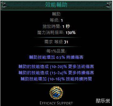 【效能(Efficacy Support)】: 10-20% 更多法术伤害. 15-24% 更多持续伤害. 增加 10-16% 技能持续时间.