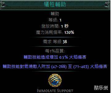 【牺牲(Immolate Support)】:对抗燃烧敌人时附加 (1级 47-71 20级 268-403) 火焰伤害