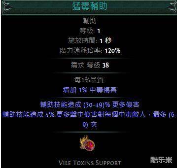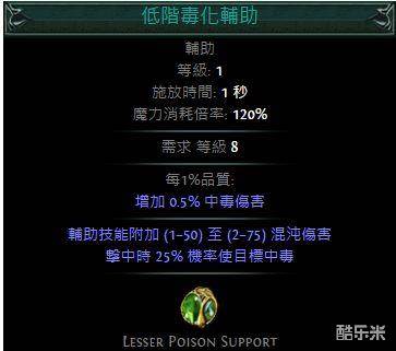 【低阶毒化(Lesser Poison Support)】:附加 (1级 1-2 20级 50-75) 混沌伤害. 25% 几率造成中毒.