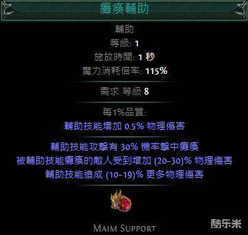 【瘫痪(Maim Support)】:对瘫痪敌人造成 20-30% 更多物理伤害. 10-19% 更多物理伤害. 30% 造成瘫痪