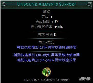 【异常爆发(Unbound Ailments Support)】:增加敌人 (30–49)% 异常持续时间. 增加 (20–30)% 敌人异常效果