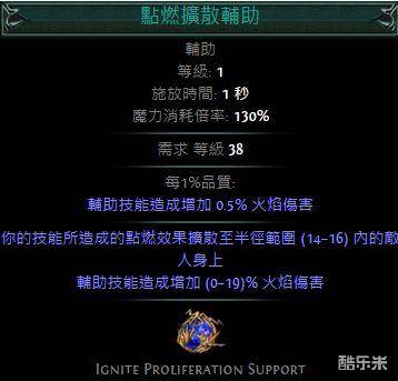 【点燃扩散(Ignite Proliferation Support)】:点燃扩散到周围 (14–16)范围. 技能增加 (0–19)% 火焰伤害.