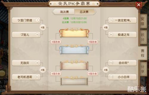 淘汰赛最后一场将在12月15日晚21点开打,到底是宠儿队延续他们的不败神话,还是新晋挑战者ツ歪门邪道队将其拉下马?让我们拭目以待!