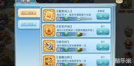 1、日常任务里面有月卡任务,玩家可以在游戏中进行充值,充值过后玩家就拥有月卡了,而且月卡每天都可以获取若干元宝。