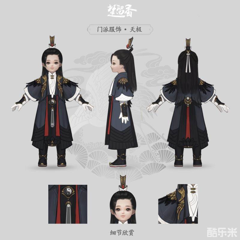 不同于师兄们的款式,小道长“天极”套装的衣襟间与后腰缀有红色带子,配色上更为活泼明朗,小改黑金主色的沉重。佩戴上镶有红珠的高束发冠,更贴近孩童的天真气质。