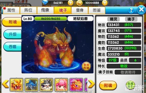 在精灵达到60级,紫色品质,并且达到6星或以上的前提下,可使用魂石召唤魂子,得到魂子才可让精灵附魂触发战力提升。魂晶是魂子的升级材料,通过回收1级魂子可以产生魂晶。魂子之间能够相互吞噬以加速魂子的等级成长,从而提升战力。