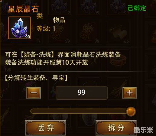 星辰晶石可在“锻造-装备洗炼”界面消耗晶石洗炼装备,提升装备属性,装备洗炼功能会在 开服第10天后开启。除了福利活动赠送的星辰晶石外,我们还可以通过分解转生装备和探宝活动来获取星辰晶石。