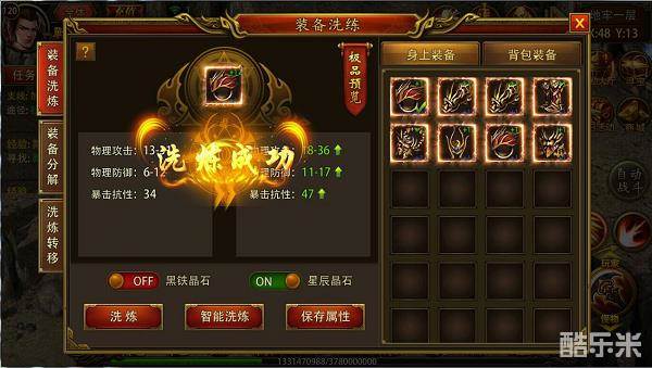 转3以上的装备可进行分解,产出黑铁及星辰晶石每洗炼消耗材料黑铁矿石可自动购买,星辰晶石无法自动购买