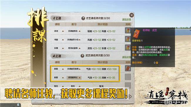 小师妹拥有才艺、武艺两种可视化的属性数值,前者的多寡将影响“游历”奇遇的触发,后者包括力道、根骨等我们熟悉的“五维”,而这部分属性将按照初始20%的比例转化给角色自身。才艺、武艺两种属性的重要性不言而喻,而提升这些属性将是师妹养成玩法中的重要环节,我们可以通过排布课程来实现这一点,而师资阵容将影响到某门课程完成后的属性值奖励多寡,消耗两种道具:名师帖武艺、名师帖才艺可以聘请名师任教,让小师妹的学艺效率更高,而这两种道具可以通过青梅令商店兑换、商城购买礼包获得。