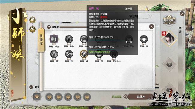 小师妹拥有六格技能槽,由合击技与五种被动技构成,通过积累学艺天数可以逐步解锁这些技能槽,技能槽用于装载对应的技能,这些技能效果可100%提供给主角。两种类型的技能均有等级提升的空间,合击技目前仅有“怒梅·喋血”一种供选择,被动技有提升外攻、内攻、共修折算比例(属性转换)等不同属性侧重的多达11种技能,以颜色区分为金色、紫色、蓝色技能,不同品级的技能拥有不同的等级上限,蓝色技能满级为20级,紫色技能满级为30级,金色技能满级则为40级。