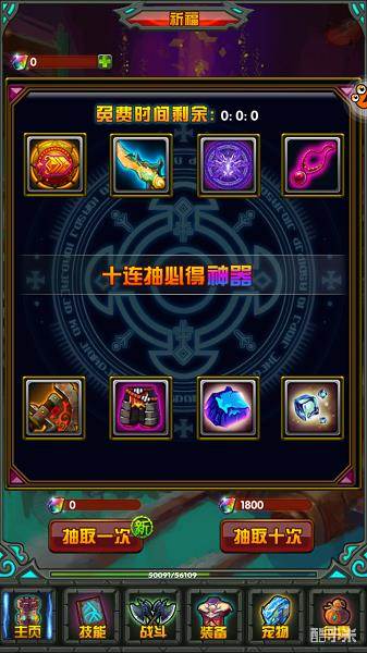 啥都不用说了,开始抽吧,抽到什么东西全看人品。这个里面最差的东西也是百万金币,也就是说直接给你1000000的金币,不过也有坏处,32小时才能免费抽取一次,不过土豪请随意,当我没说。左边那个10连抽可以获得一把神器,没试过,穷,要是有土豪大爷试了请告诉我