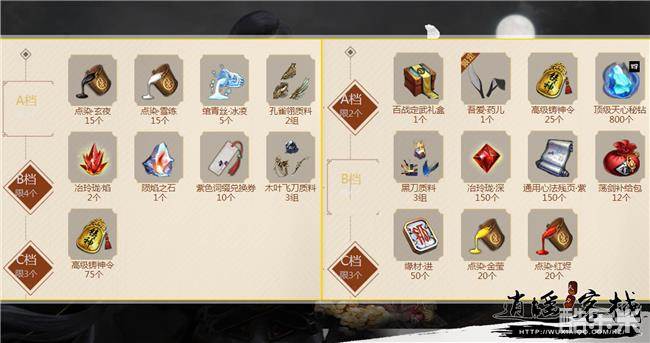 A档(限选两个):绾青丝·冰凌×5、点染·玄夜×15、点染·雪练×15、孔雀翎质料2组、冶玲珑焰×2、陨焰之石×1、紫色词缀兑换券×10、木叶飞刀质料3组、高级铸神令×75;