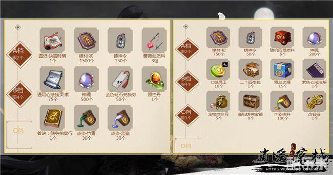 D档(限选三个):缘材·初×750、铸神令×50、随机四盟质料6个、神魄×200、七级灵玉×10、二十四格背包×1、青丝之耀×15、紫色心法注解×1、宠物续命丹×5、高级铸神宝箱×8、丰彩染料×100、改名符×1。