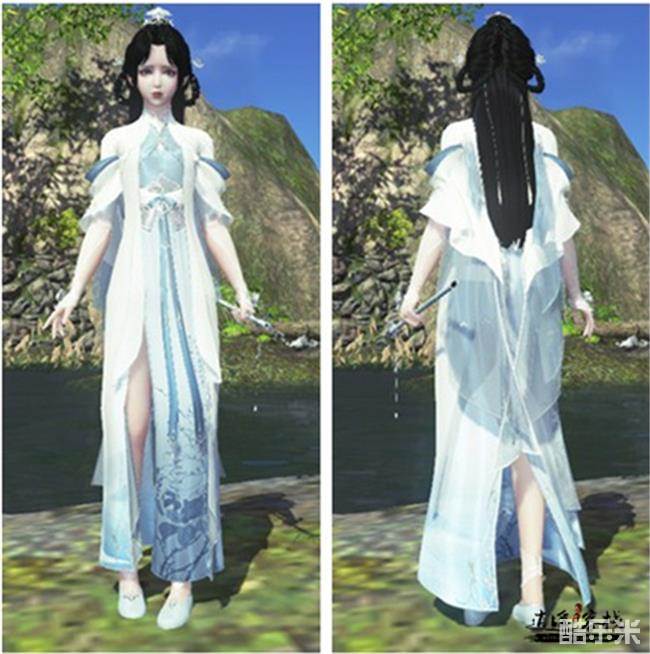 衣装方面,与成女相同,都是白色到蓝色再到蓝灰色渐变的颜色,褶皱的袖子设计,总体而言无太大差异,但衣服下摆的白色却更亮。