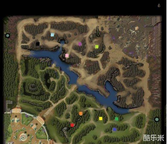 双野分为两种,一种是让一个刷新点刷出两波野来拉兵线,在53秒A一下野怪,引野怪向左或向右导致野怪离开野点,这样在0秒时系统判定野点没有野怪便会自动刷新。另一种是用2个刷新点的野怪来拉兵线。在上图中,天辉是蓝绿两个野点,先拉蓝点的野,等最后一个野怪还剩半血时开一棵树,把上面绿点的野怪拉下来,这样蓝点的野怪死亡时正好就和绿点的野怪交火了。同理夜魇的天蓝色点和黑色点,先拉天蓝色点。
