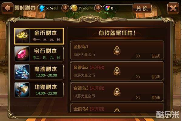 金币副本:通过每个层会固定获得该层掉落的金币奖励