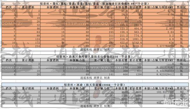 图三是红烬、蓝瓷、竹青与金莹的各档次魅力值统计,这里的分界基数同样是以40金碎银1点魅力来分界高性价比和中性价比,以100金碎银一点魅力来分界中性价比与低性价比,竹青与金莹的价格因为没有官方途径可以100%获得,所以萝北是以情人箭价格为参考,至于具体性价比同样是请小可爱们查看表格。