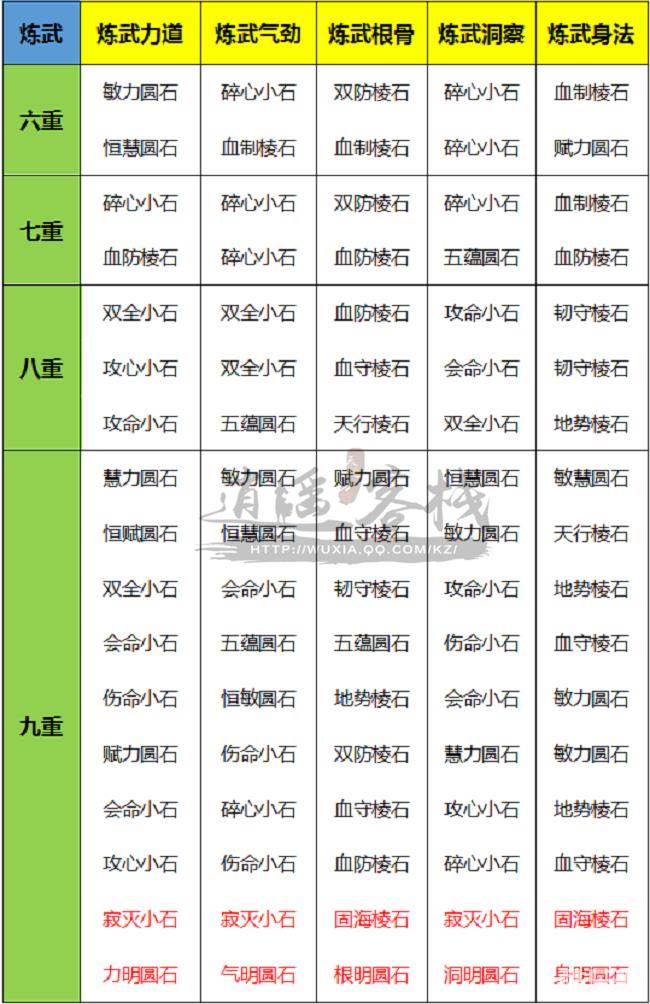 为了方便大家更为直观的对比炼武心法,将五本炼武心法所需的砭石消耗整理到一张表上,方便需要的朋友们进行收藏。