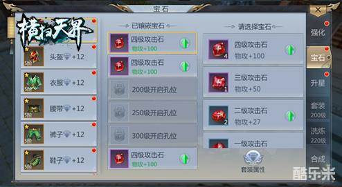 装备达到条件后可开启宝石孔,对应的宝石可镶嵌在装备上。高级宝石可替换已经镶嵌在装备上的低级宝石。镶嵌宝石等级达到一定数值后可激活套装属性加成,大幅提升战力。