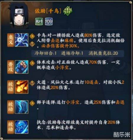 佐助每次释放奥义自身提升20%体术、忍术和连击率。技能点评:通过使用奥义来叠加自身的输出能力,让佐助[千鸟]在后期可打出更高的伤害。