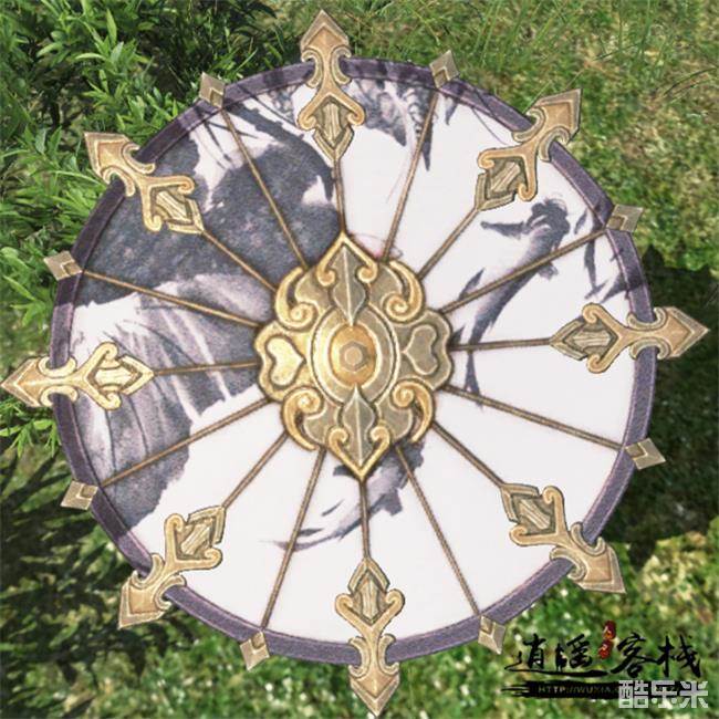 千秋节:40-50级制造装备复刻获得,这把伞的伞面写了非常多的字,中间以紫色与金色的正方形作为装饰。