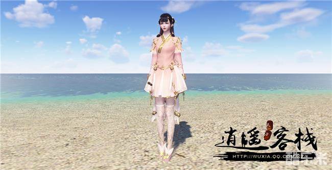 落梅也是属于参考了汉服版型设计的外观,其形制脱胎自交领襦裙,还有半臂元素。整套外观使用粉色为主打色调,以金色饰边及花纹点缀,看起来既有小女儿的娇嫩又不失大家风范。