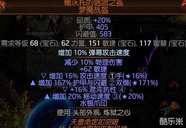 水银头 提供了必要的敏捷 (如果不带水银头的话 就需要天赋点一到两个敏捷大点) 不错的攻速和极其可观的移动速度 虽然有减少10%物理伤害的负面效果 不过基本可以无视