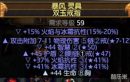 另外一枚戒指 同样抗性 生命 点伤为主 智力也是必要的 另外说一下 金装部位加成的智力至少需要70以上 否则某些技能等级会成问题 比如集中和增加范围