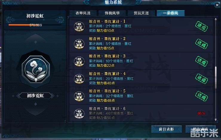 如图一所示,这是墨红的魅力值界面,这里是消耗了40个染料,然后按照这里的档次是达到了第5档,单级增加了48点魅力值,相对来说的话萝北觉得这个魅力值并不是很划算。