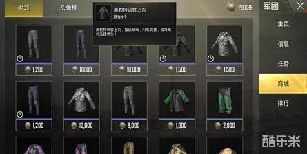 3、下图第一排从左往右数的第三个就是一直要寻找的黑豹特训官上衣,永久获取的价格为10000军团币,有时长限制的为1500军团币。