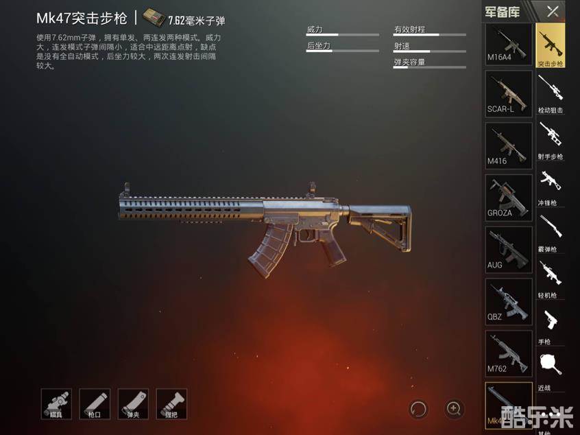 MK47——7.62毫米口径突击步枪中的一员,优点是威力较大,二连发弹道的子弹间隔小,适合中远距离点射;缺点是后坐力较大,两次连发间歇时间较久。