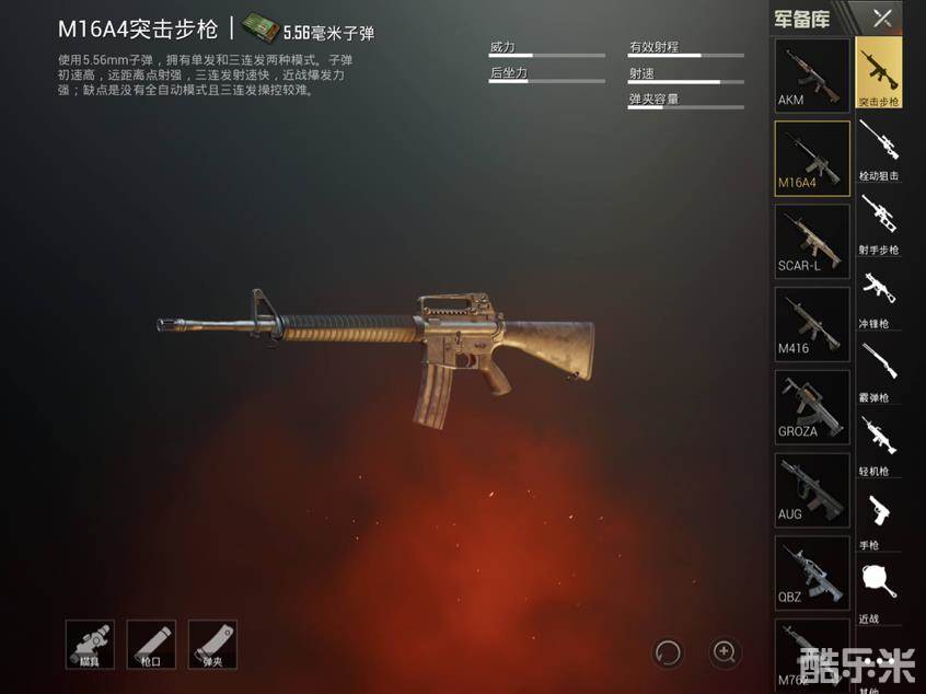 M16A4——属性方面的表现中规中矩,最大的缺点就是没有全自动模式且三连发模式操作难度较高;最大的优点是子弹初速高和近战较强的爆发力,单发开火模式下适合远距离点射。