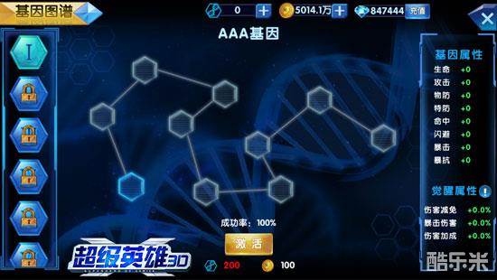 玩家在进入《超级英雄3D》英雄信息界面,正在左上角就能够找到基因图标,点击即可进入基因图谱中。基因图谱总共有十层基因,每一层的基因都有10个关键遗传序列需要玩家去激活,每激活一个关键序列都能够使某一属性获得提升。