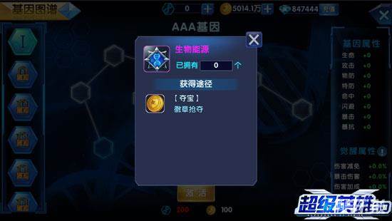 玩家们在界面的右侧就可以看到当前基因激活和觉醒所提供的属性加成啦!值得注意的是,激活基因的生物能源需要玩家们在夺宝中去抢夺获得,玩家们还是需要多多抢夺,保证自己基因激活的资源。另外基因激活是有成功率的,激活基因越多,基因等级越高,成功率越低。