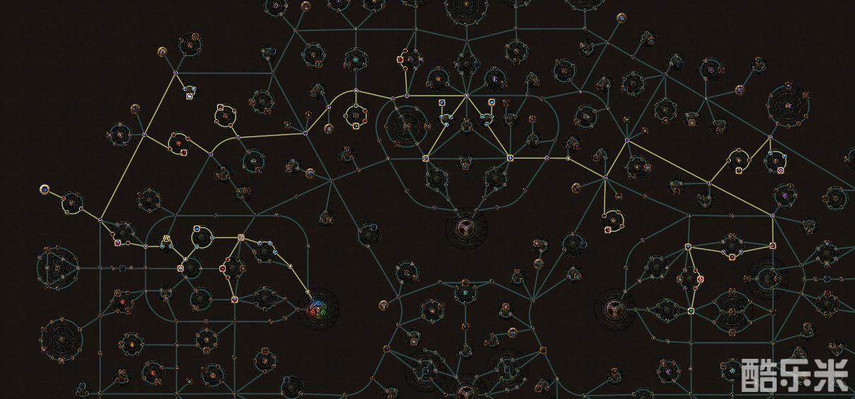 红色标记出来的是血量天赋,黄色标记的是暴击天赋,白色是范围天赋,蓝色标记的是核心天赋。天赋加点的路线为最先点到蓝色位置,后续加点顺序红色》白色》黄色。
