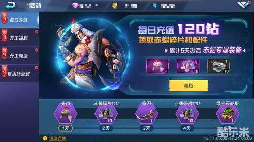 活动内容:武者登陆《魂武者》手游,在活动期间内,每天充值满12元,就能获得奖励,第一天可获得赤蝎配件1(头巾),赤蝎碎片*10,升级芯片*10。另外,累计充值的天数越多,奖励也就越多。