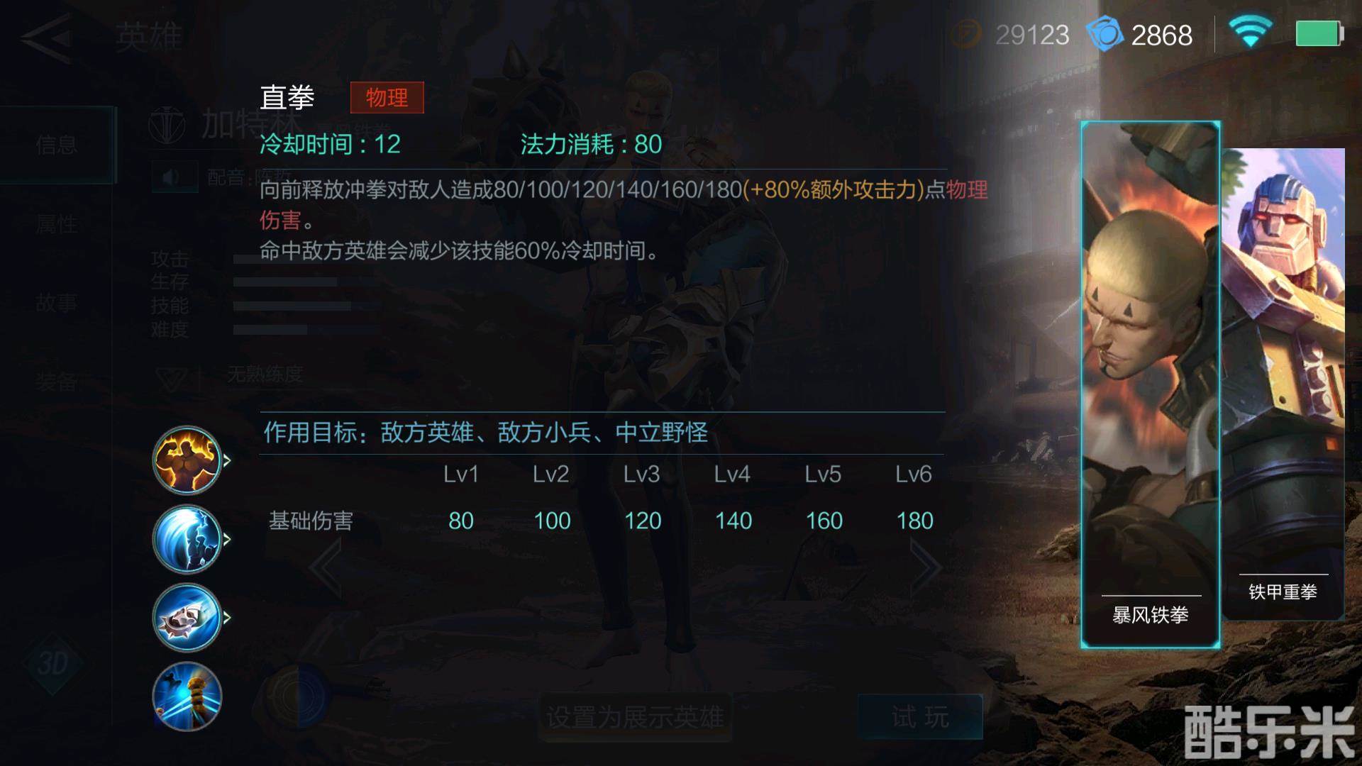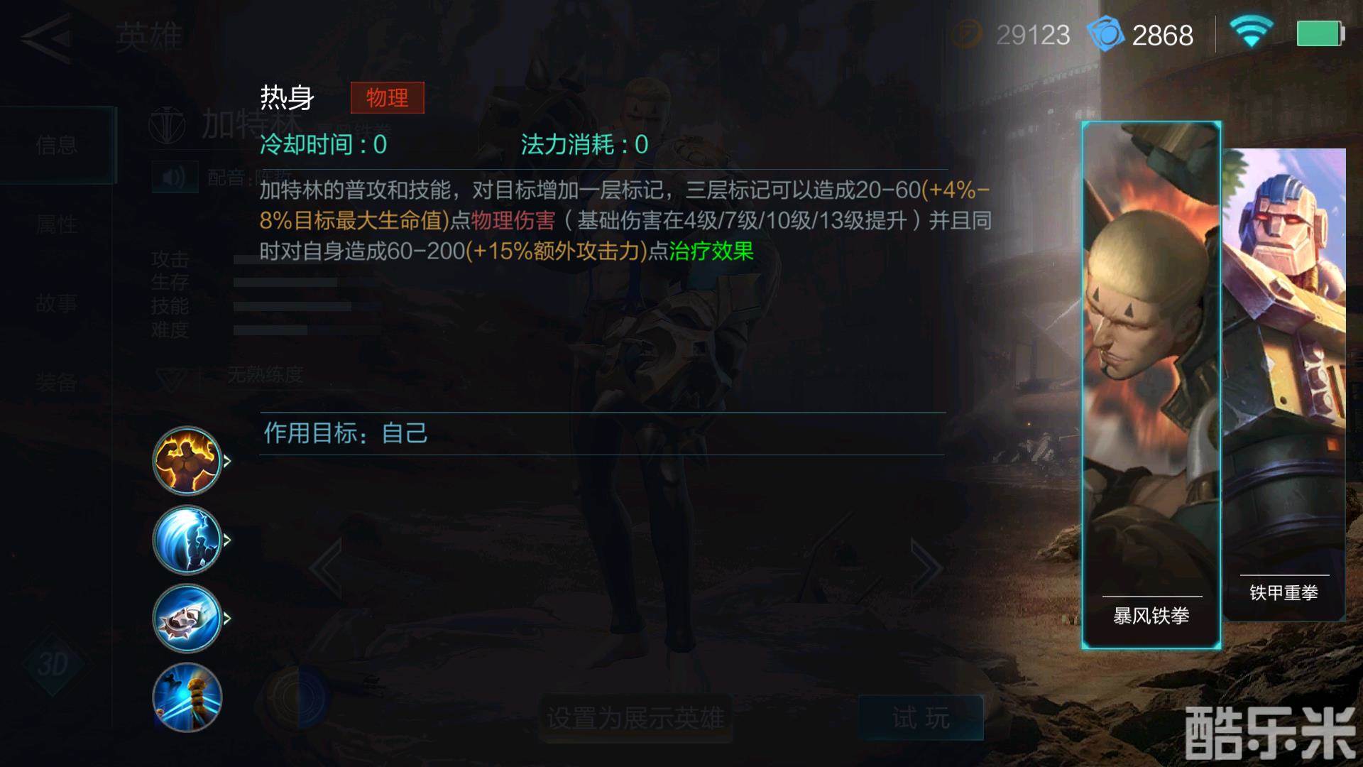在激战狂潮手游中,暴风铁拳加特林也是一个非常强势的战士英雄了,不仅如此,他还有着回复能力、突进能力,以及可以说得上是超强的开团能力,那么这个英雄的技能是怎么样才能拥有这次能力的呢?让我们一起来看看吧。