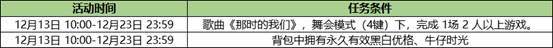 毛不易XQQ炫舞主题曲《那时的我们》暖心发布,带你重温和老朋友一起走过的炫舞时光,目前这首歌已正式登陆游戏对局啦!12月13日10:00-12月23日 23:59,前往世界地图-活动中心-活动精选参与“疯狂打歌季”,携毛不易小哥哥为你献礼~